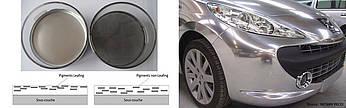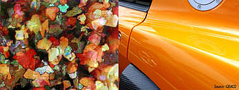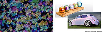 Le cœur des particules est opaque et réfléchissant, avec plusieurs couches d'enrobage, ce qui a pour conséquence l'apparition de différentes couleurs d'interférences. Ces peintures produisent de nombreux changements de couleur selon l'angle de vue. Ainsi lorsqu'on tourne autour du véhicule, on perçoit différentes couleurs. On les appelle plus communément : « peintures caméléon » ou « à effet caméléon ».