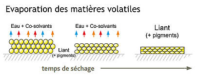 Les co-solvants entrainent les molécules d'eau plus lentes à l'évaporation permettant au liant restant, qui emprisonne les pigments, à se restructurer sur le substrat.