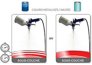 Exemple ci-dessus : Le voile de placement nécessaire aux teintes métallisées se fera sans temps d'attente pour certaines marques et avec pour d'autres. Idem pour les couches intermédiaires, certains fabricants préconisent un séchage entre 2 couches et d'autres n'en ont pas besoin.