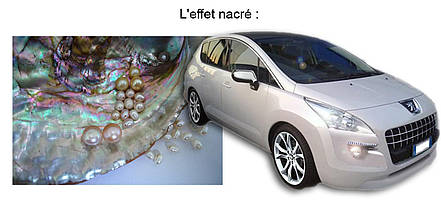 Les pigments à cœur transparent de mica : les nacres, perles ou pearl en anglais, caractérisés par leur forme lamellaire, leur très faible épaisseur, leur transparence et leur alignement dans le feuil de peinture, ils permettent à la lumière visible qui les traverse d'être simultanément réfléchie et transmise. La famille des micas enrobés d'oxyde titane ou de fer utilisée en automobile se divise en trois catégories : les nacres blanches, les nacres irisées (ou interférentielles) et les nacres colorées.