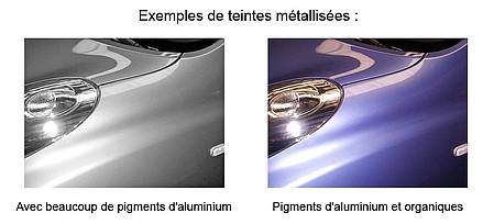 La particularité des coloris métallisés réside dans un brillant et une luminosité du film de peinture, grâce à l'ajout de pigments d'aluminium obtenus par le broyage du minerai.