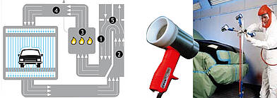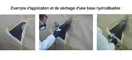 L'application de la base hydrodiluable doit se faire dans une cabine de peinture répondant aux normes en vigueur. Les cabines servant à l'application des peintures solvantées conviennent parfaitement à l'application de la base hydrodiluable. Il faut toutefois contrôler la vitesse d'air et la température conformément aux consignes préconisées par les fiches techniques des fabricants.