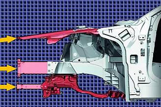 De plus, la voie haute et la voie basse sont en principe entretoisées, ce qui permet d'optimiser la rigidité et la stabilité de l'ensemble. Cette structure avant ainsi constituée concrétise une stratégie d'absorption des chocs évoluée. Elle permet de mieux répartir l'énergie et donc de présenter une intéressante synthèse :