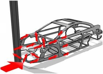 La structure d'un véhicule est étudiée pour dissiper l'énergie d'un choc de façon programmée en intégrant un certain nombre d'évolutions comme la triple voie d'effort, pour atteindre des objectifs de sécurité plus