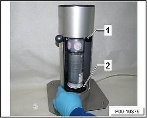 | Après le remplissage, retirer l'ensemble (bombe + godet) de l'appareil. Enlever le capuchon (1) du godet (2). Le tampon de remplissage se trouve à présent plaqué à l'intérieur du capuchon. Placer la tête de pulvérisation (3) sur l'aérosol |
