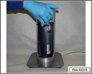 - Retirer le percuteur rouge du capuchon de l'aérosol, et placer le sur la tige située à la base de l'aérosol, sans l'incliner. Placer l'aérosol muni du percuteur, capuchon en bas, sur un support stable et horizontal.