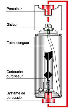 | Le chargeur, relié à un compresseur d'air comprimé, actionne automatiquement le vérin qui va injecter la peinture dans la bombe, lors de la fermeture du cache. L'opération dure une dizaine de secondes seulement. |