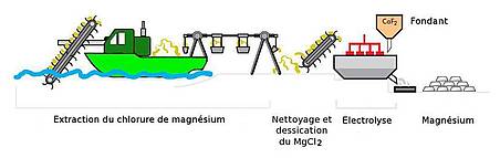 - Par électrolyse d'eau de mer, de saumures ou de minéraux contenant du magnésium, ce qui fait que les ressources sont quasiment inépuisables. Cependant, pour l'extraction, ce n'est pas l'oxyde qu'on utilise, mais un sel de magnésium industriel que l'on appelle chlorure de magnésium.