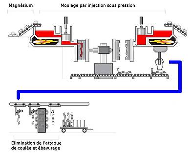 Ensuite l'alliage de magnésium en fusion est injecté à forte pression et grande vitesse dans un moule permanent appelé coquille. La pièce moulée refroidit dans le moule, puis est éjectée après ouverture du moule qui sera réutilisé pour mouler d'autres pièces. Après l'opération de moulage, les pièces sont débarrassées de l'attaque de coulée et des bavures.