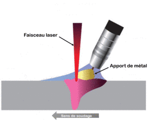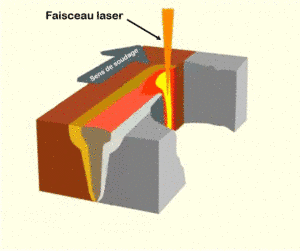 Sous l'action du faisceau laser, la surface des matériaux irradiés s'échauffe rapidement jusqu'à atteindre la température de fusion du métal d'apport, qui, injecté en général sous forme de fil, se dépose et vient adhérer sur les surfaces des pièces pour assurer la liaison après refroidissement.