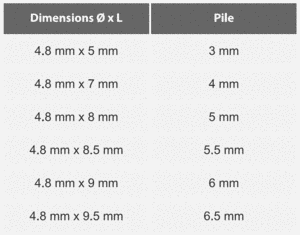 Les rivets auto-poinçonneurs sont disponibles en différentes tailles selon l'épaisseur cumulée des panneaux à fixer (pile). Pour la longueur préconisée des rivets, jusqu'à 3 mm d'épaisseur de l'assemblage, la longueur préconisée est de e + 2 mm et à partir de 4 mm d'épaisseur de l'assemblage, e + 3 mm. Le diamètre dépend du constructeur.Exemple de dimensions conseillées: