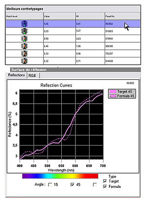 Ceci sert à prédire si de légères variations du procédé d'application (raccord ou bord à bord ?) ou de la formule (écart colorimétrique ou métamérisme important ?) affecteront de manière significative la couleur finale. Le logiciel propose des réglages pour modifier la formule proposée afin de se rapprocher au plus près du coloris analysé.