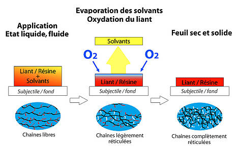 Le séchage par l'oxygène de l'air est un des plus anciens processus de formation du film. Les liants séchant par oxydation sont caractérisés par la présence, dans leur chaîne macromoléculaire, de doubles liaisons. Après l'évaporation des solvants, la réaction de séchage se poursuit par l'addition d'oxygène sur les doubles liaisons. Ce phénomène est accéléré par l'adjonction de catalyseurs appelés siccatifs. La formation du film se fait sans apport d'énergie (chaleur).