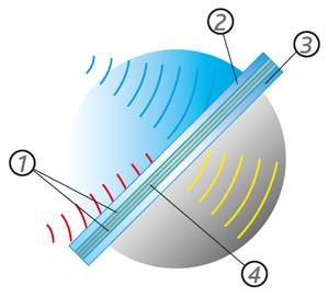 (1) PVB, (2) Verre extérieur, (3) Verre intérieur, (4) Résine amortissante