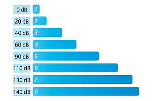 La réaction de l'ouïe humaine au niveau sonore n'est pas linéaire. Une augmentation du niveau sonore de 10 dB (donc une multiplication du bruit par 10) est ressentie par notre ouïe comme un doublement du bruit.