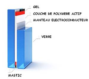Malgré tout, l'électrochromisme n'est autre chose que la réalisation d'une batterie solide entre deux plaques de verre. Les éléments « mobiles » sont des protons ou des ions lithium : sous l'influence d'un champ électrique produit par la tension entre deux couches conductrices déposées sur chacun des verres, ces ions se déplacent entre les différentes couches déposées entre les plaques.