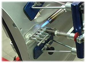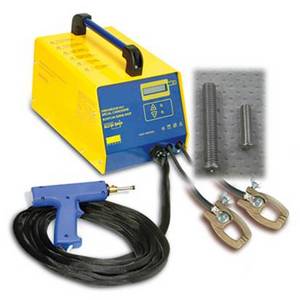 Tire-clous aluminium (spotter) avec les goujons soudables en aluminium munis d'une pointe d'amorçage de diamètre 4 à 6 mm (disponible chez tous les fabricants de poste à souder).