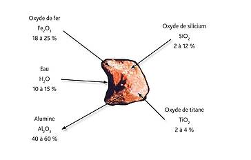 La bauxite est un mélange d'oxyde d'aluminium, l'alumine, d'oxyde de silicium, d'oxyde de fer, d'oxyde de titane et d'eau. Les teneurs de ces différents éléments sont variables selon les minerais :