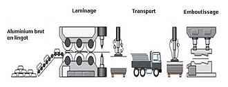 Une fois que l'aluminium a été extrait et transformé par addition des éléments d'alliage, il faut bien sûr lui donner sa forme définitive. La mise en forme s'exécute en deux temps. Tout d'abord, le matériau brut doit être laminé pour obtenir des tôles, en plusieurs étapes jusqu'à ce que l'épaisseur de tôle voulue soit atteinte. Ensuite, les tôles sont mises en forme selon les exigences par emboutissage.