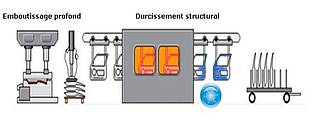 Mais après l'emboutissage, les éléments de carrosserie en aluminium sont encore trop tendres, c'est pourquoi leur rigidité doit être augmentée par durcissement structural (traitement thermique : chauffe et refroidissement). C'est aussi lors de ce traitement thermique que les éléments d'alliage établissent une liaison avec l'aluminium, déforment le réseau atomique et engendrent par là-même une plus grande rigidité.