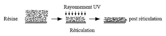 Quand la résine est exposée à un rayonnement UV, des photo-amorceurs (composants réagissant sous l'action de la lumière) rompent les liaisons pour former des radicaux libres (molécules instables). Les radicaux libres, en se propageant entre les chaines de polymères (structure enfermant des milliers d'atomes), créent des liaisons entre celles-ci, ce qui entraîne la polymérisation. La résine ne séchera pas complètement si l'énergie fournie est insuffisante.