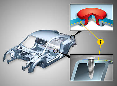 Lors d'une réparation, il est important de rétablir la conductivité électromagnétique à l'aide de vis CEM M5 auto taraudeuses en acier à revêtement spécial. En cas de non-respect de cette consigne, tous les composants situés en aval du point de sectionnement ne sont plus correctement reliés à la masse. En présence de champs magnétiques haute fréquence (par exemple le système d'allumage), ces composants agissent comme des antennes émettrices. Les ondes électromagnétiques peuvent perturber à la fois la réception de la radio et les boîtiers électroniques embarqués. Un courant élevé risque par ailleurs de circuler dans les rivets, ce qui peut provoquer l'échauffement de ceux-ci et par là-même l'endommagement de la colle.