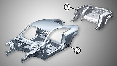 Dans le cas d'une collision, un endommagement d'éléments de carrosserie en aluminium comme en acier est possible. L'endommagement d'une pièce du bloc arrière en acier (1) et du panneau latéral aluminium (2) par exemple sur l'Audi TT.