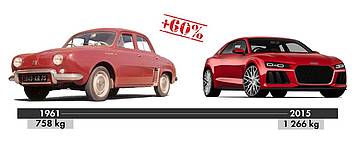 Il ne faut pas oublier non plus le fait que les exigences de sécurité et de confort n'ont cessé de croître ces dernières décennies, en conséquence de quoi un nombre toujours plus grand de systèmes de sécurité et de confort sont proposés de série ou en option. Ces différentes évolutions ont eu pour conséquence d'alourdir les véhicules et en cinquante ans, le poids moyen des véhicules a augmenté de 60 %.