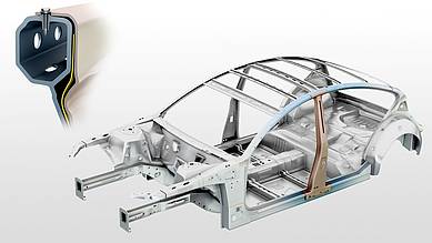 Ou inversement, pour la carrosserie de la A8, tout en pérennisant le concept Aluminium Space Frame qui a fait ses preuves, introduire un montant B (pied de milieu) en acier THLE trempé directement après formage à chaud. Cette construction permet d'optimiser encore la rigidité de la carrosserie ainsi que son comportement en collision. Ici l'assemblage est réalisé par vissage Fowdrill en partie haute.