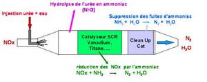 Le système SCR : avec l'emploi d'un additif AdBlue, la réduction des NOx est possible afin de les transformer en N2 + H2O