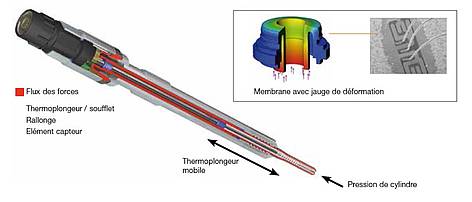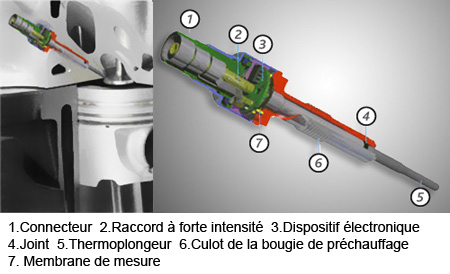 L'élément chauffant n'est pas emmanché en force dans le corps de la bougie, mais se déplace de quelques microns à l'intérieur de celui-ci pour transmettre la pression à une membrane de mesure piézo-résistive. Le calculateur, développé par Texas Instrument, permet un suivi de l'évolution de la pression de combustion dans la culasse.Le capteur combine une large bande passante avec un faible rapport signal/bruit et une compensation de température. Ce capteur permettra de repousser les limites de sécurité, de corriger l'injection cylindre par cylindre et de mieux gérer les bruits.