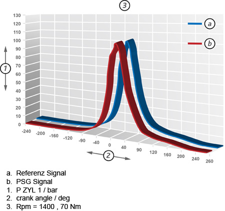 Les courbes de pression suivantes montrent la marche du signal d'une bougie PSG et celle du signal d'un capteur de référence dans la chambre de combustion d'un banc d'essai moteur.