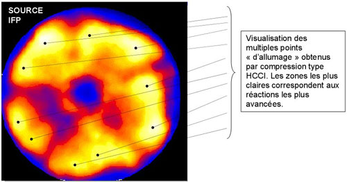 Un exemple de ce genre de situation vous est fourni (à partir d'un document issu de l'IFP) ; nous pouvons constater que la zone d'inflammation s'étend quasiment à toute la chambre de combustion, ce qui indique la grande rapidité du phénomène, et que plusieurs zones de réaction ont initié cette combustion.