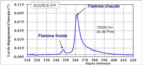 Ce terme, pour le moins paradoxal, décrit un phénomène qui se déroule à des faibles températures (<400°C) et donc nettement avant la fin compression. Il est sensible sur la courbe d'analyse de la combustion ci-dessus.