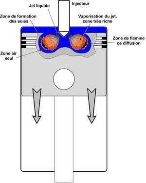 Le principale inconvénient de cette combustion est qu'elle est hétérogène. C'est à dire que pendant le déroulement de la combustion, il y a des zones riches (excès de carburant provoquant la fabrication des particules) et des zones pauvres (excès d'air provoquant la fabrication des Oxydes d'ozotes NOx).