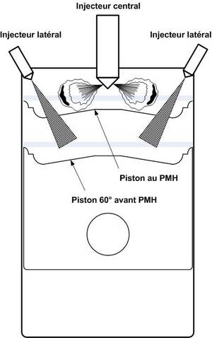 C'est la stratégie PREDIC/MULDIC qui utilise 3 injecteurs dans le cylindre. La disposition judicieuse des jets respectifs permet d'atteindre tout le volume de chambre quelle que soit la position piston. Les impacts des jets sur les parois seront réduits grâce à un phasage particulier : l'injection sur les côtés est très précoce (100 à 200° avant PMH) puis l'injection centrale débute environ à 40° avant PMH pour le PREDIC ou passe en injection tardive (2° et 30° après PMH) pour le MULDIC. Les injecteurs latéraux utilisent une pression d'injection de 1500b (2000b au centre), si besoin leur débit peut être fractionné.