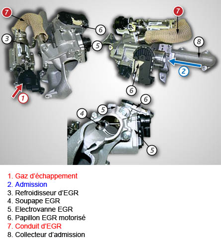 Sur les moteurs de dernière génération, la vanne EGR électromécanique est directement implantée dans le collecteur d'admission (ensemble compacte plus efficace et moins couteux), avec en plus un papillon d'EGR. l