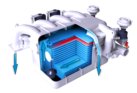 Dans ce cas, l'admission d'air est faite en partie d'air frais et de gaz d'échappement refroidis. La longueur de la canalisation EGR permet un abaissement significatif de la température des gaz.