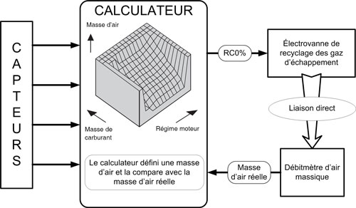 Le calculateur reçoit les informations des capteurs, et détermine une masse d'air de consigne. Avec une commande électrique (RCO), le calculateur commande l'électrovanne de recyclage des gaz d'échappement, ainsi la masse de gaz admis dans le moteur dépend de cette commande, et influe sur le signal du débitmètre d'air massique. Le calculateur compare la masse d'air réelle avec celle de consigne, et ajuste si besoin sa commande sur l'électrovanne.(Commande en boucle fermée)