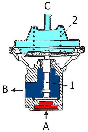 Lorsque la dépression modulée par l'électrovanne EGR s'applique en (C), la soupape (1) se soulève, afin de permettre aux gaz d'échappement de s'introduire dans le circuit d'admission.