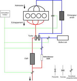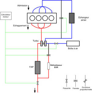 Pour que les gaz d'échappement (en rouge) puissent être admis à l'admission (en bleu), il faut que la vanne EGR s'ouvre. Pour cela, l'électrovanne EGR, précisément pilotée (RCO) par le calculateur, applique une dépression sur la vanne EGR qui s'ouvre pour doser la quantité de gaz d'échappement admis. Au même moment, le débitmètre d'air massique indique au calculateur la masse d'air admise (moins l'EGR) dans le moteur. Ainsi le calculateur connait précisément la masse de gaz d'échappement introduit dans le moteur, et peut moduler et affiner cette masse en agissant de nouveau sur l'électrovanne EGR.
