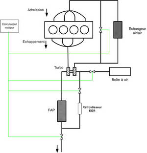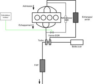 Dans un moteur diesel, la pression régnant dans le collecteur d'échappement est supérieure à celle régnant dans le collecteur d'admission. C'est cette différence de pression qui permet au gaz d'échappement de circuler vers le collecteur d'admission.
