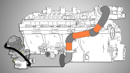 Pour améliorer l'effet de l'EGR, la quantité de gaz d'échappement recyclée est refroidie dans un échangeur de chaleur traversé par le liquide de refroidissement du moteur. De ce fait, la densité augmente dans le collecteur d'admission, et la température de fin compression est plus basse. Cela permet d'abaisser nettement les taux de NOx (jusqu'à 20%)