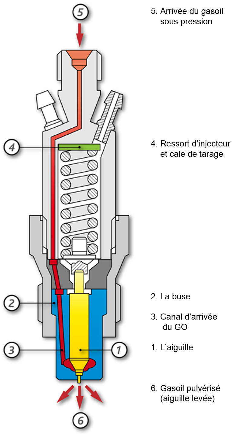 La pompe à injection refoule le gasoil qui vient exercer une pression sur le cône de poussée de l'aiguille (1). Quand la force exercée sur le cône dépasse la force de tarage du ressort, l'aiguille se soulève, il y a donc injection.