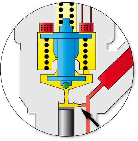 Un point commun entre les deux injecteurs est l'élément de commande équilibré en pression. Pour augmenter les pressions d'injection maximales, le débit de fuite a du être réduit. En comparant les injecteurs, on voit que dans le cas du CRI 2.20, l'ensemble de l'aiguille d'injecteur est entouré de haute pression de carburant. Aucune fuite n'a lieu au-dessus et en dessous de l'aiguille d'injecteur. Par construction, le CRI 2.20 uniquement le point de fuite suivant :
