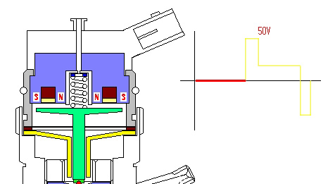 Au repos, la magnétisation de la ferrite ne permet pas d'attirer l'ancre car le ressort est suffisamment fort pour le maintient en position fermée.