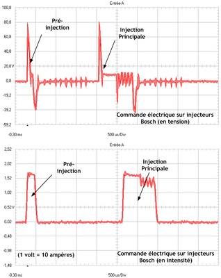 Il est possible, à l'aide d'un oscilloscope et d'une pince ampèremétrique (petit calibre) de mesurer la commande en tension et en intensité sur chaque injecteur (voir exemple).