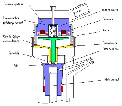 L'injecteur électromagnétique est une évolution de l'injecteur classique. C'est-à-dire que le principe de pulvérisation reste identique (aiguille et buse). En revanche, il a été ajouté une partie électrique qui permet de commander l'ouverture de l'aiguille.