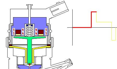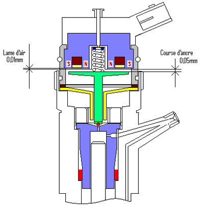 Lors de la commande de l'injecteur, le courant circulant dans la bobine crée un champ magnétique qui vient s'ajouter à l'aimantation de la ferrite ; ces deux champs attirent rapidement l'ancre jusque sur sa butée mécanique, l'injecteur est en phase d'injection.