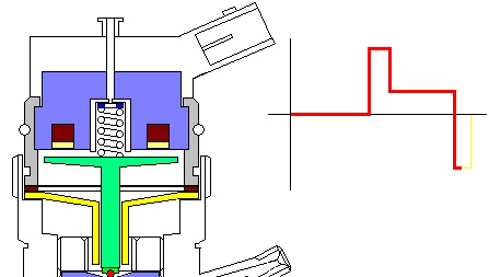 Lors de la fermeture de l'injecteur, il faut donc inverser les polarités d'alimentation de l'électrovanne, durant un temps fixe suffisamment long, afin de créer un champ magnétique permettant d'annuler le champ de la ferrite et permettre au ressort de repousser l'ancre sur la bille, comme le montre la vue ci-dessous.